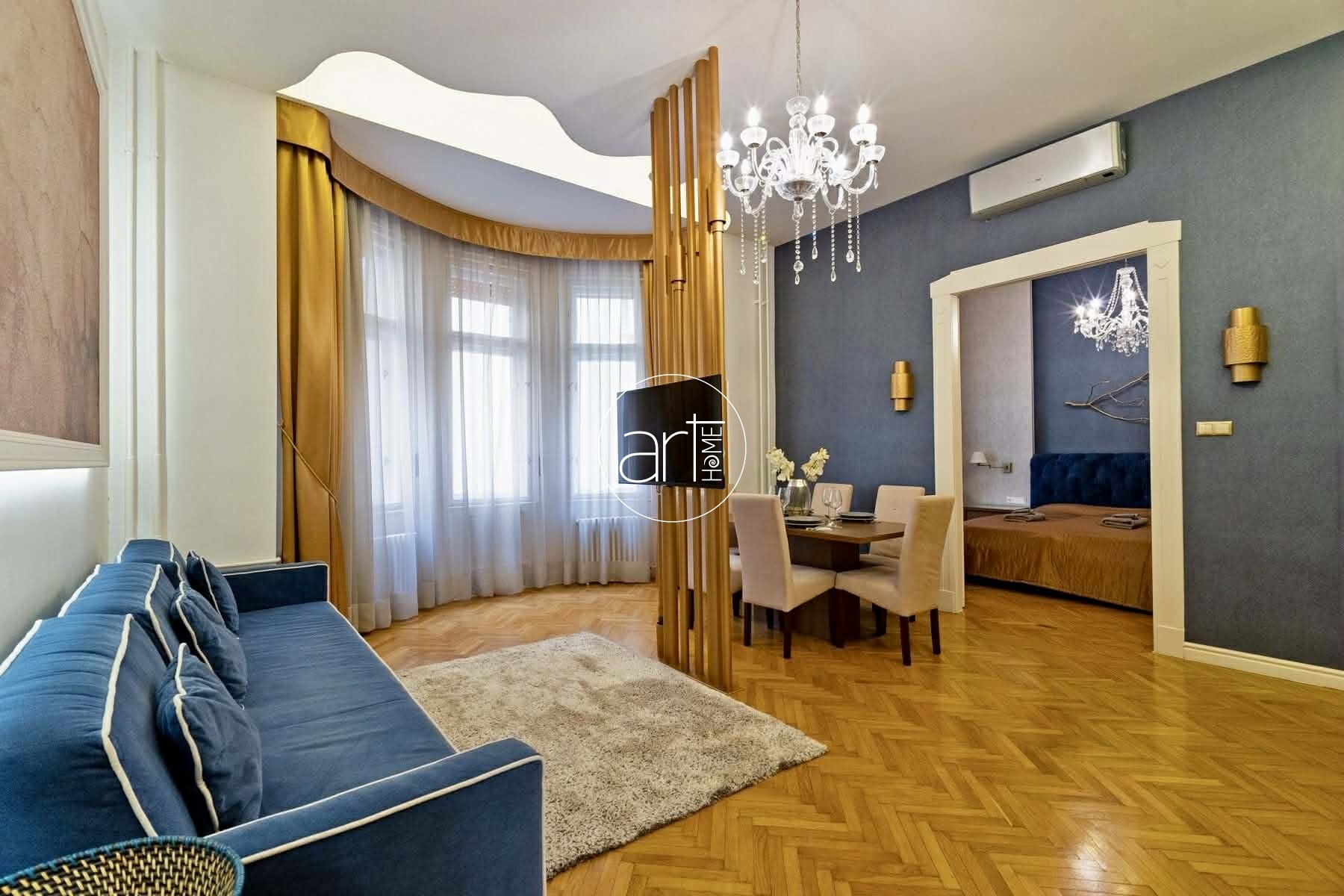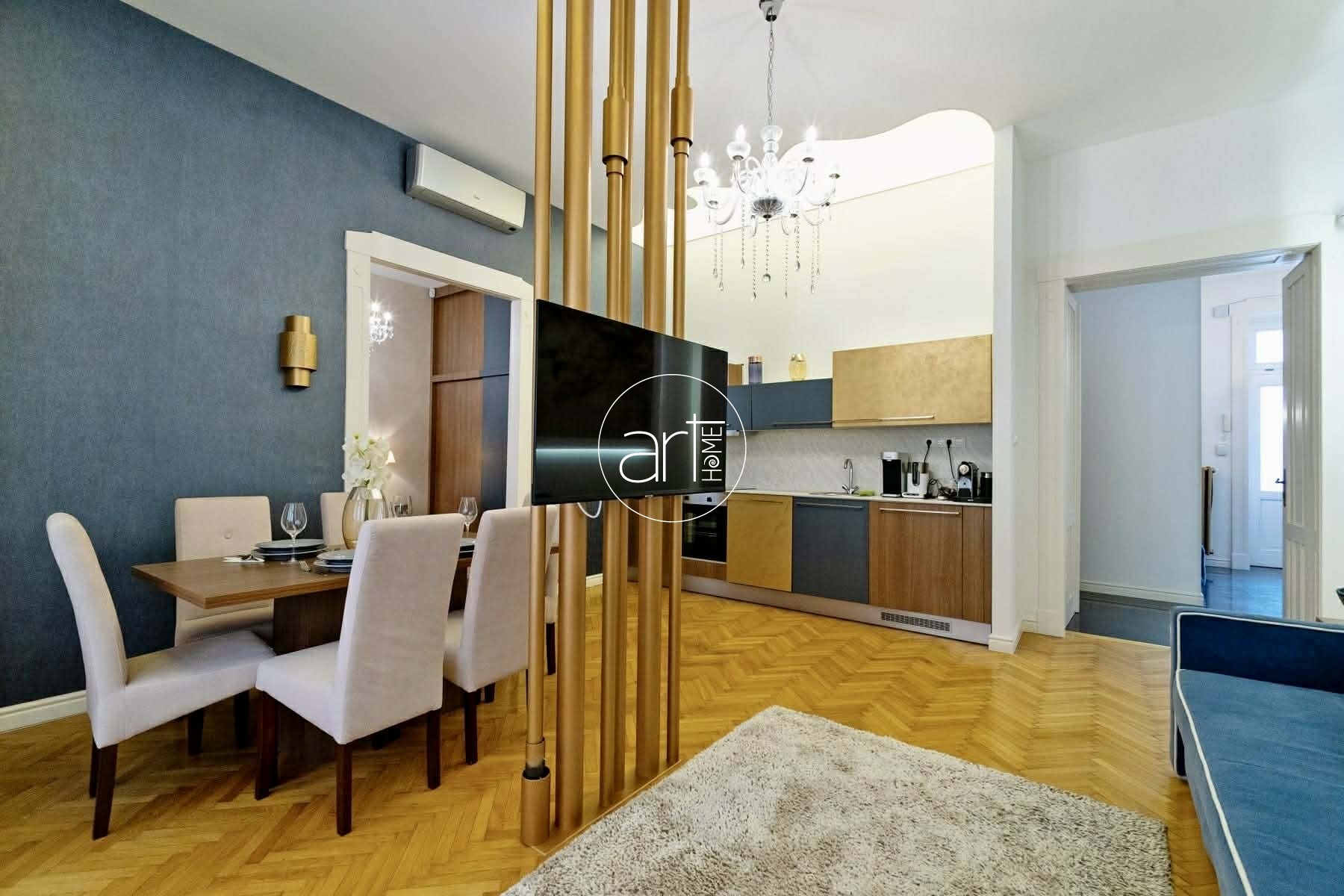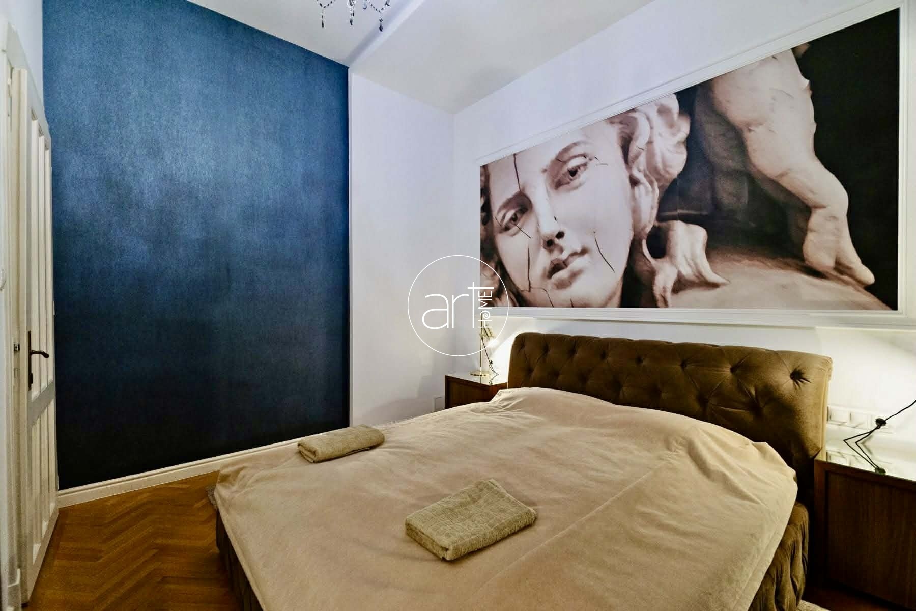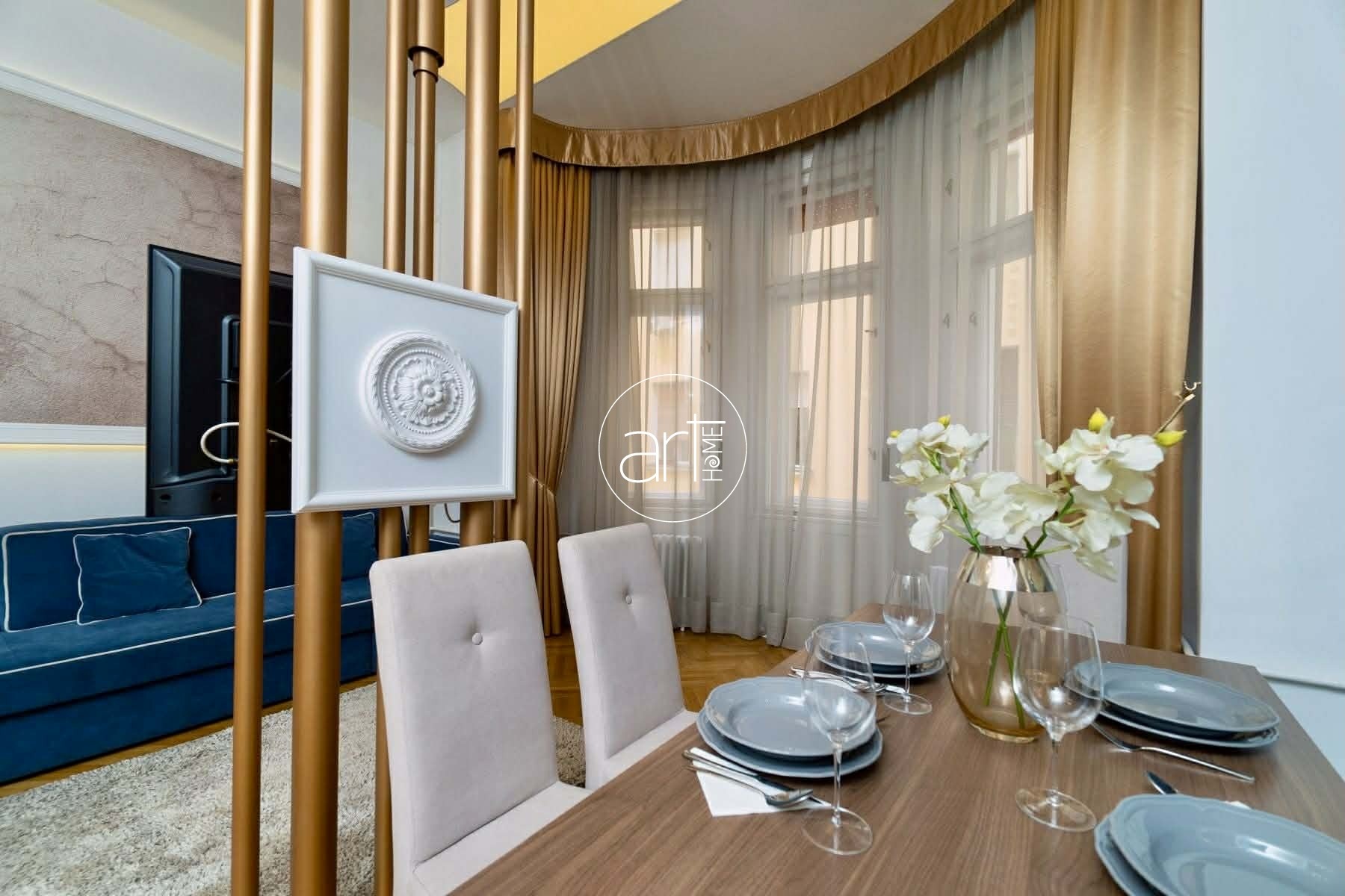 Budapest egyik legpatinásabb utcájában, az V. kerület ikonikus Október 6. utcájában kínálunk megvételre egy nappali + 2 szobás, I. emeleti, belsőépítész által megálmodott, exkluzív polgári lakást.