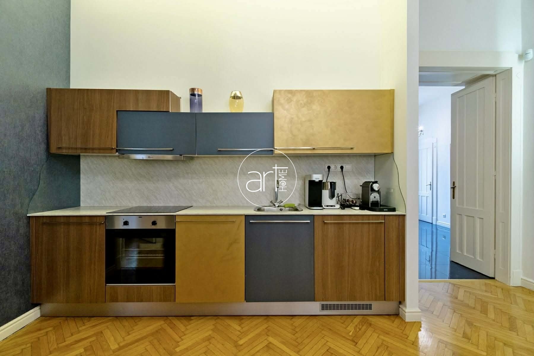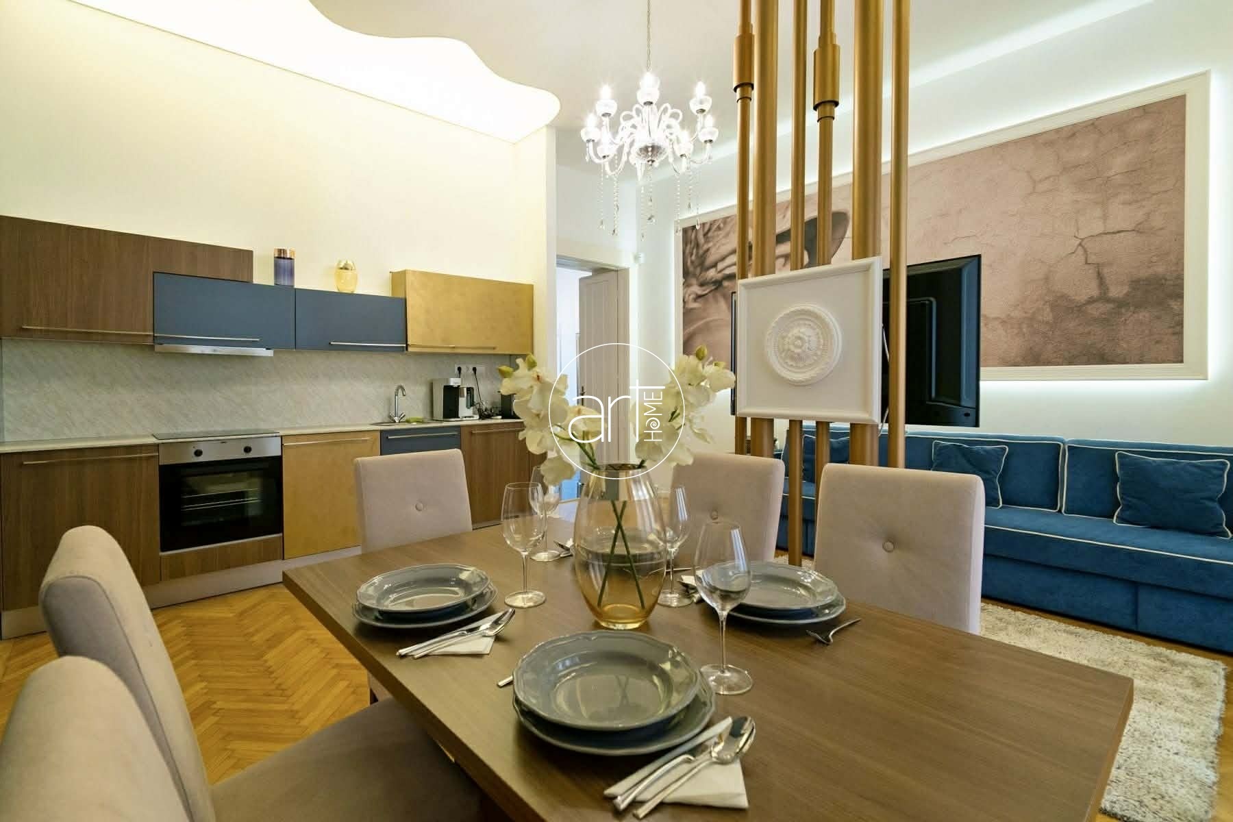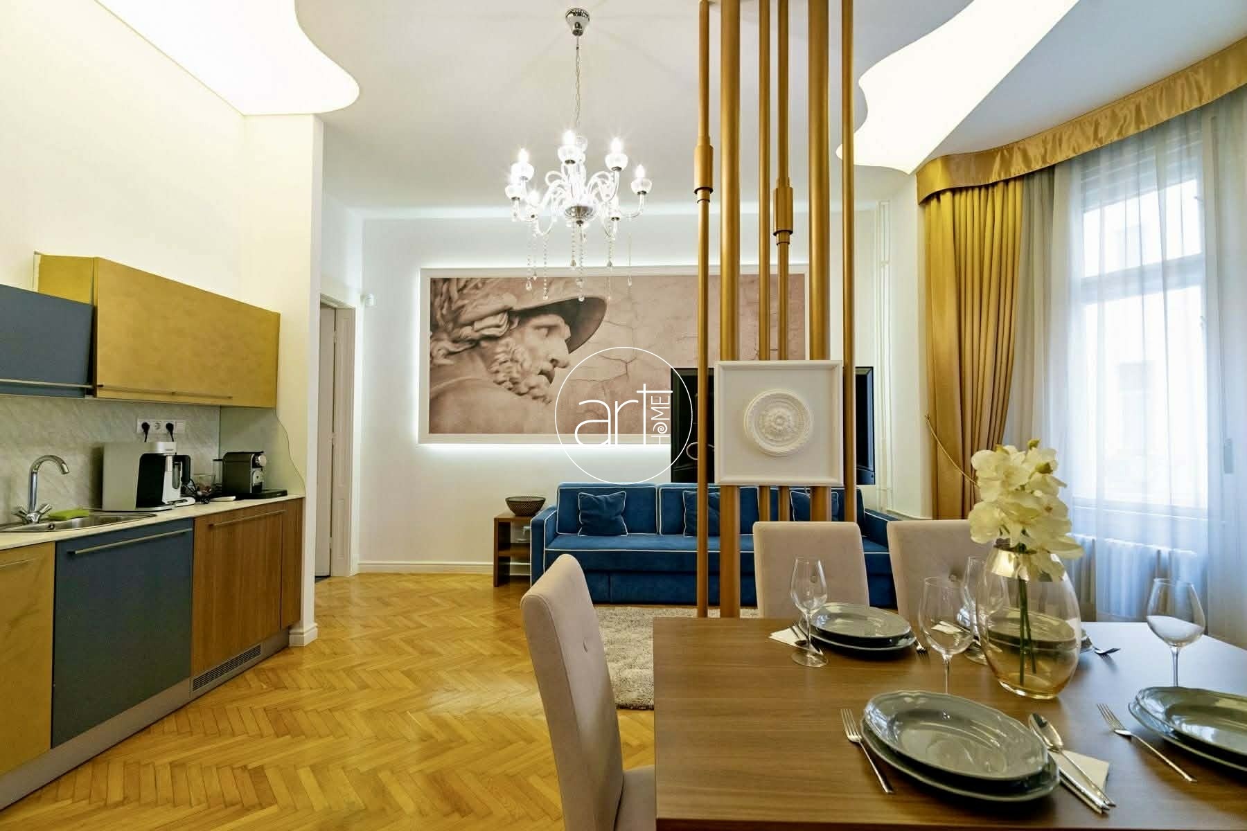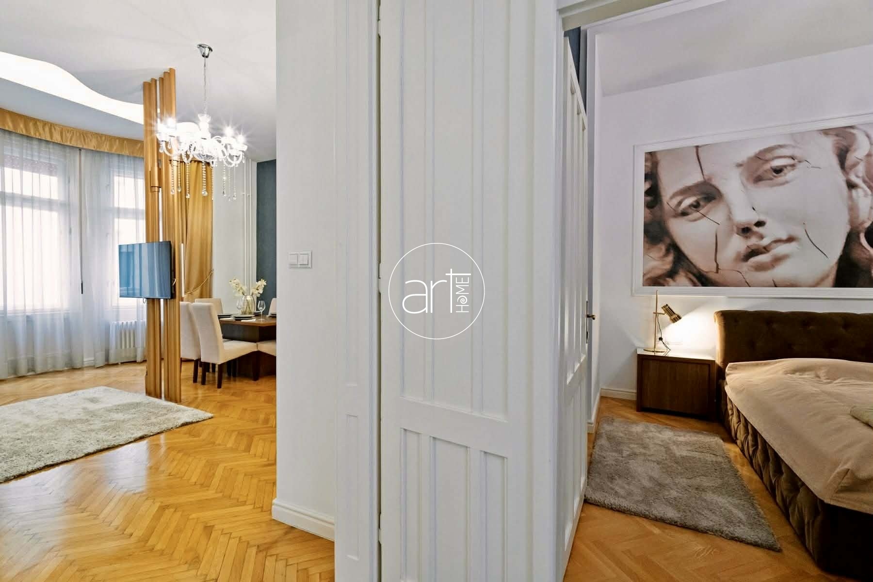Budapest egyik legpatinásabb utcájában, az V. kerület ikonikus Október 6. utcájában kínálunk megvételre egy nappali + 2 szobás, I. emeleti, belsőépítész által megálmodott, exkluzív polgári lakást.
