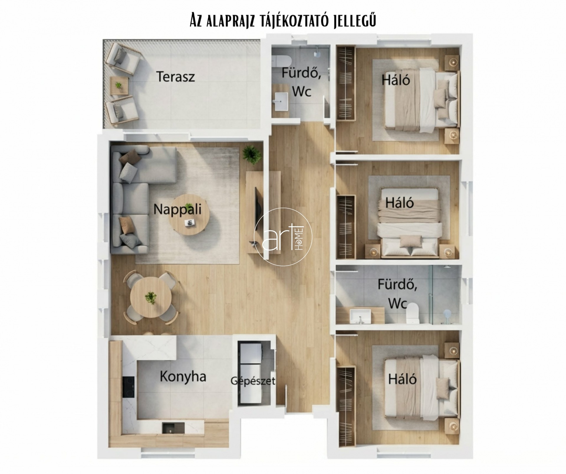 Három teljes értékű szoba, két tágas fürdőszoba került kialakításra, az amerikai konyhás nappali mellett.