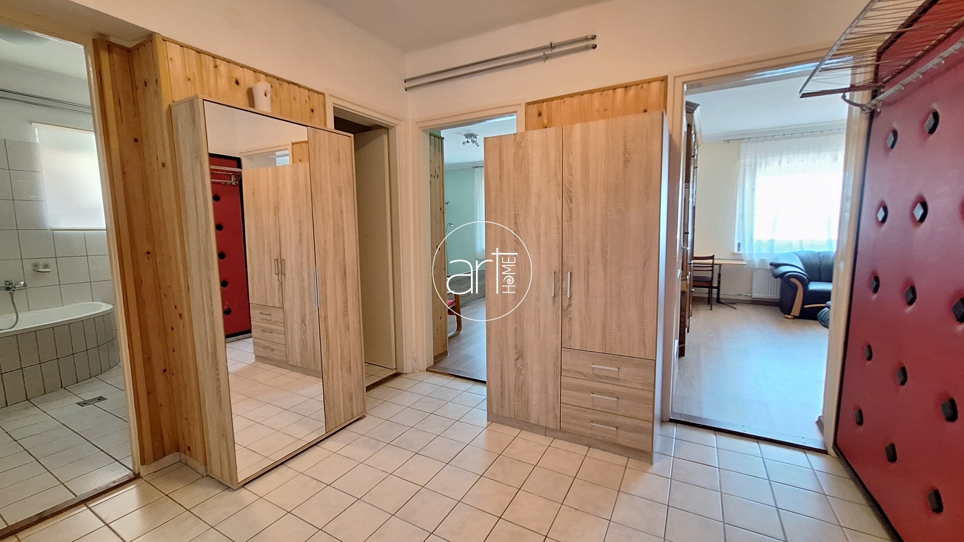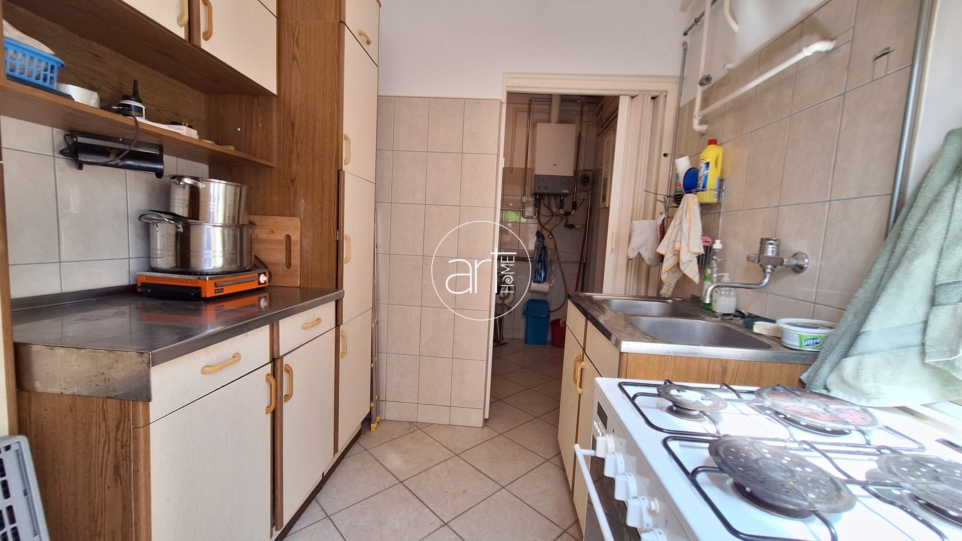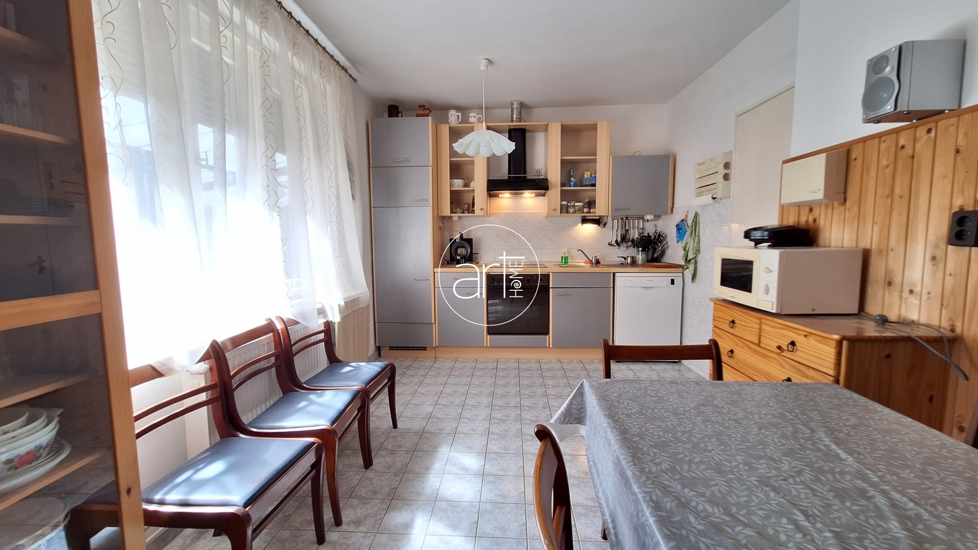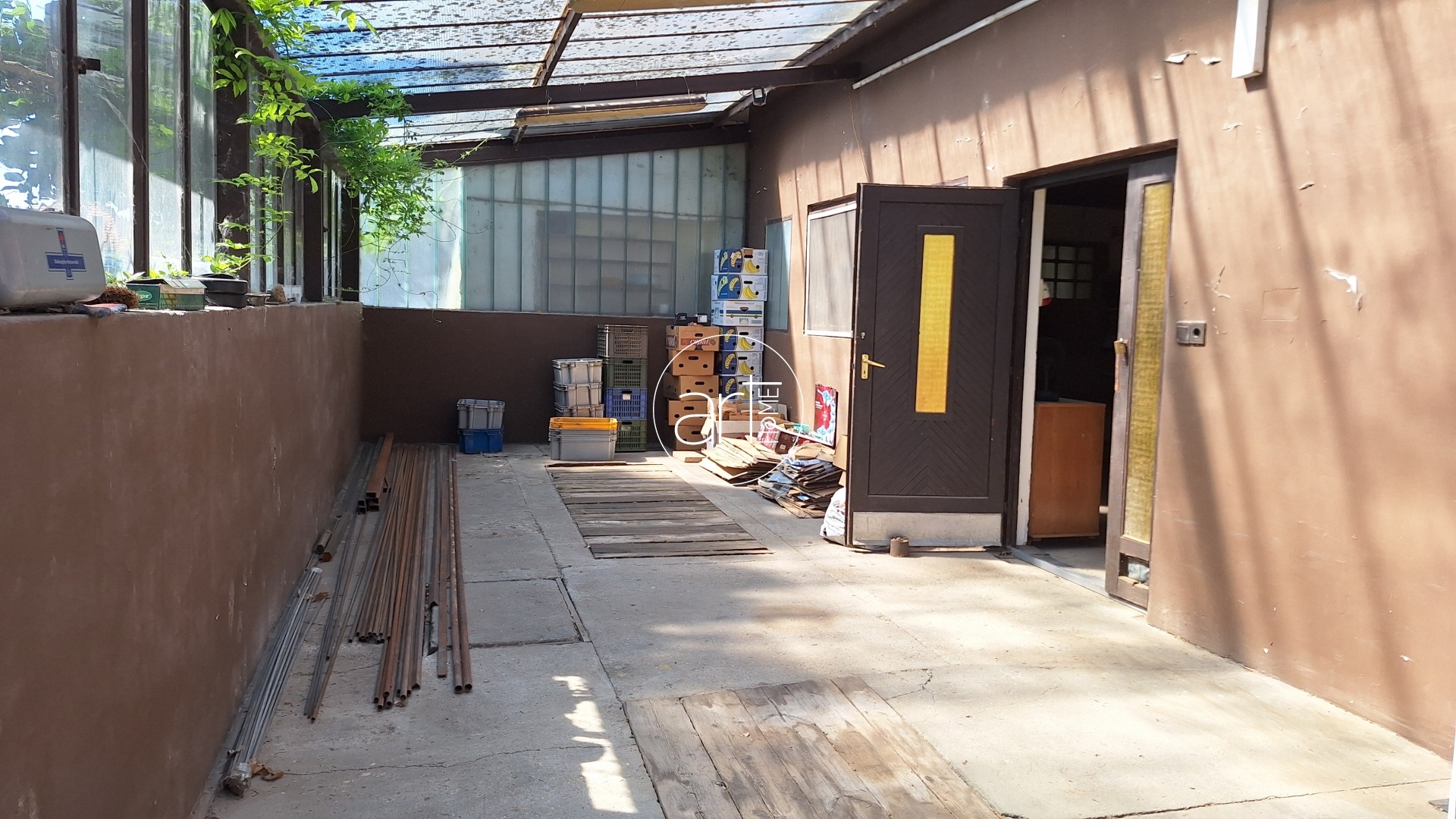 A lakótér praktikus elrendezésű. A fedett teraszról a központi hallba lépünk, innen nyílnak a helyiségek: a 2 nagyobb (17-17 m2-es) utcára nyíló, a holtágra néző ablakokkal rendelkező szoba mellett egy kisebb félszoba (kb 7 m2) is található, ez az udvar felé néz. A konyha tágas és világos, étkezővel kialakított. A beépített konyhaszekrény újszerű, gépekkel felszerelt. Egy kb 5m2-es kamra is tartozik hozzá. A WC külön helyiségben található, a fürdőszobában helyet kapott egy sarokkád. A házból közvetlen átjárás nyílik a műhely személyzeti részébe, így ideális vállalkozás melletti lakhatásra vagy telephelyként való használatra, vagy a lakórész kibővítésére is. A képen látható bútorok a vételár részét képezik!