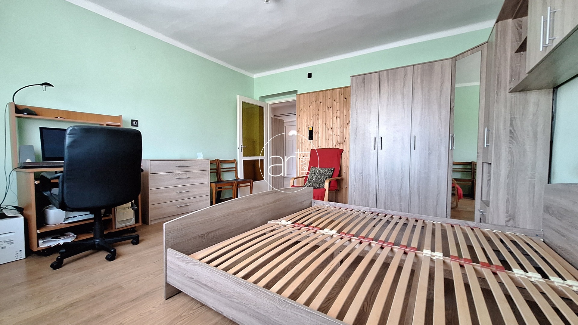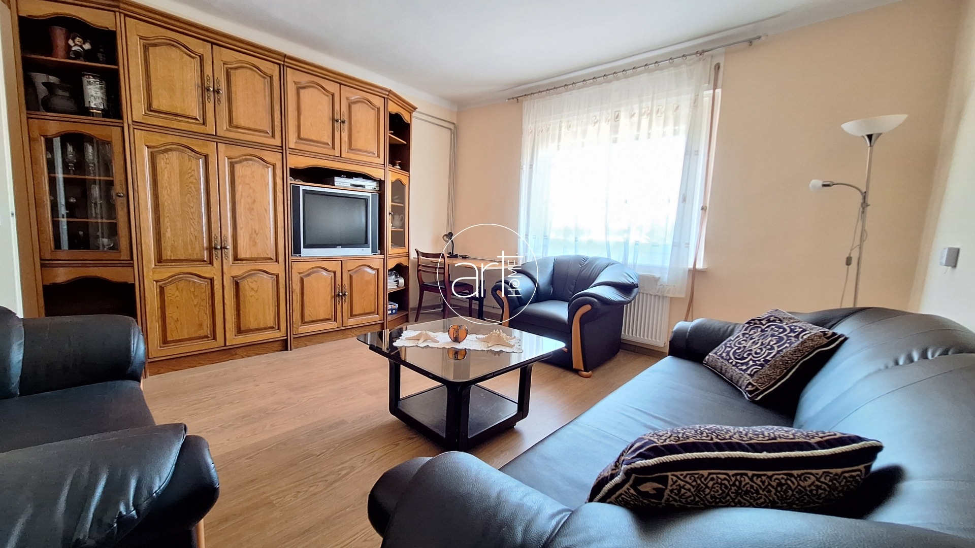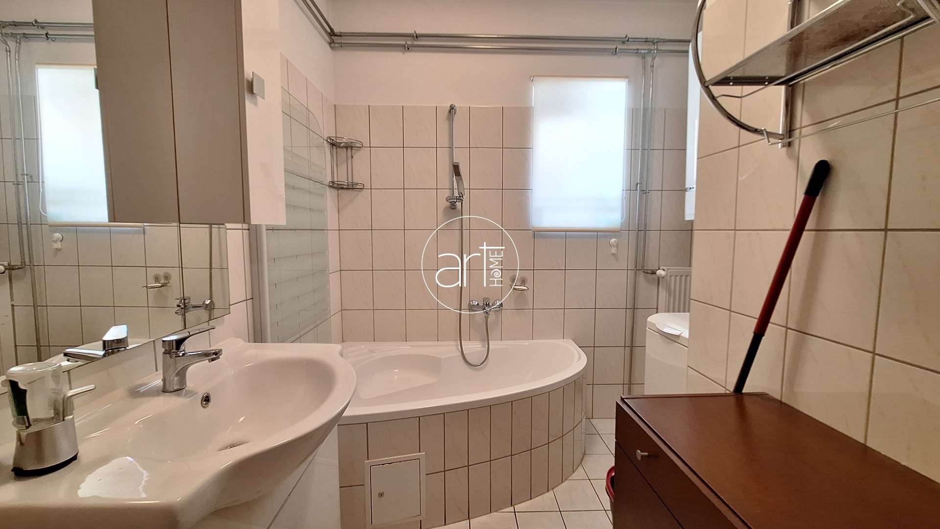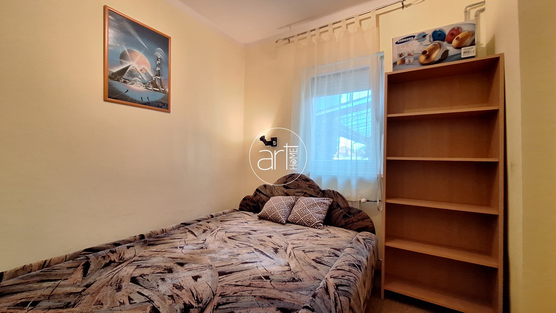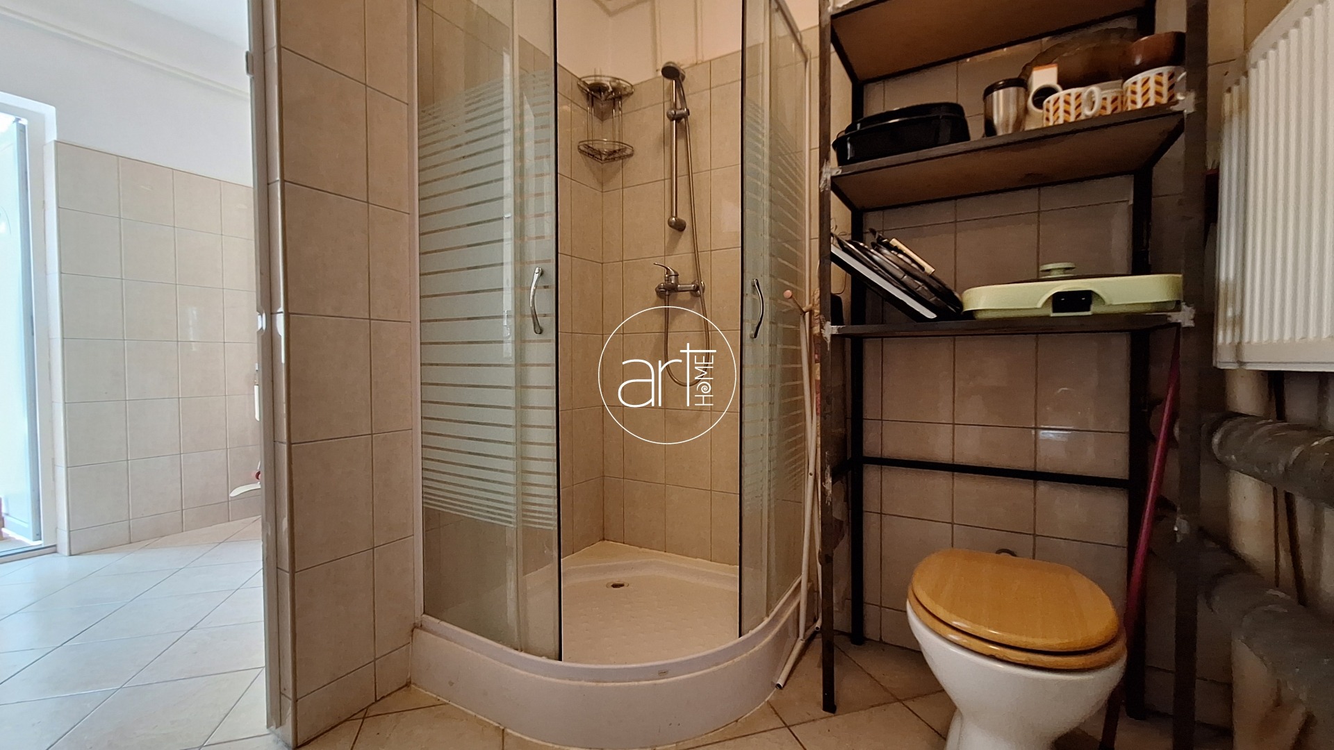 A lakótér praktikus elrendezésű. A fedett teraszról a központi hallba lépünk, innen nyílnak a helyiségek: a 2 nagyobb (17-17 m2-es) utcára nyíló, a holtágra néző ablakokkal rendelkező szoba mellett egy kisebb félszoba (kb 7 m2) is található, ez az udvar felé néz. A konyha tágas és világos, étkezővel kialakított. A beépített konyhaszekrény újszerű, gépekkel felszerelt. Egy kb 5m2-es kamra is tartozik hozzá. A WC külön helyiségben található, a fürdőszobában helyet kapott egy sarokkád. A házból közvetlen átjárás nyílik a műhely személyzeti részébe, így ideális vállalkozás melletti lakhatásra vagy telephelyként való használatra, vagy a lakórész kibővítésére is. A képen látható bútorok a vételár részét képezik!