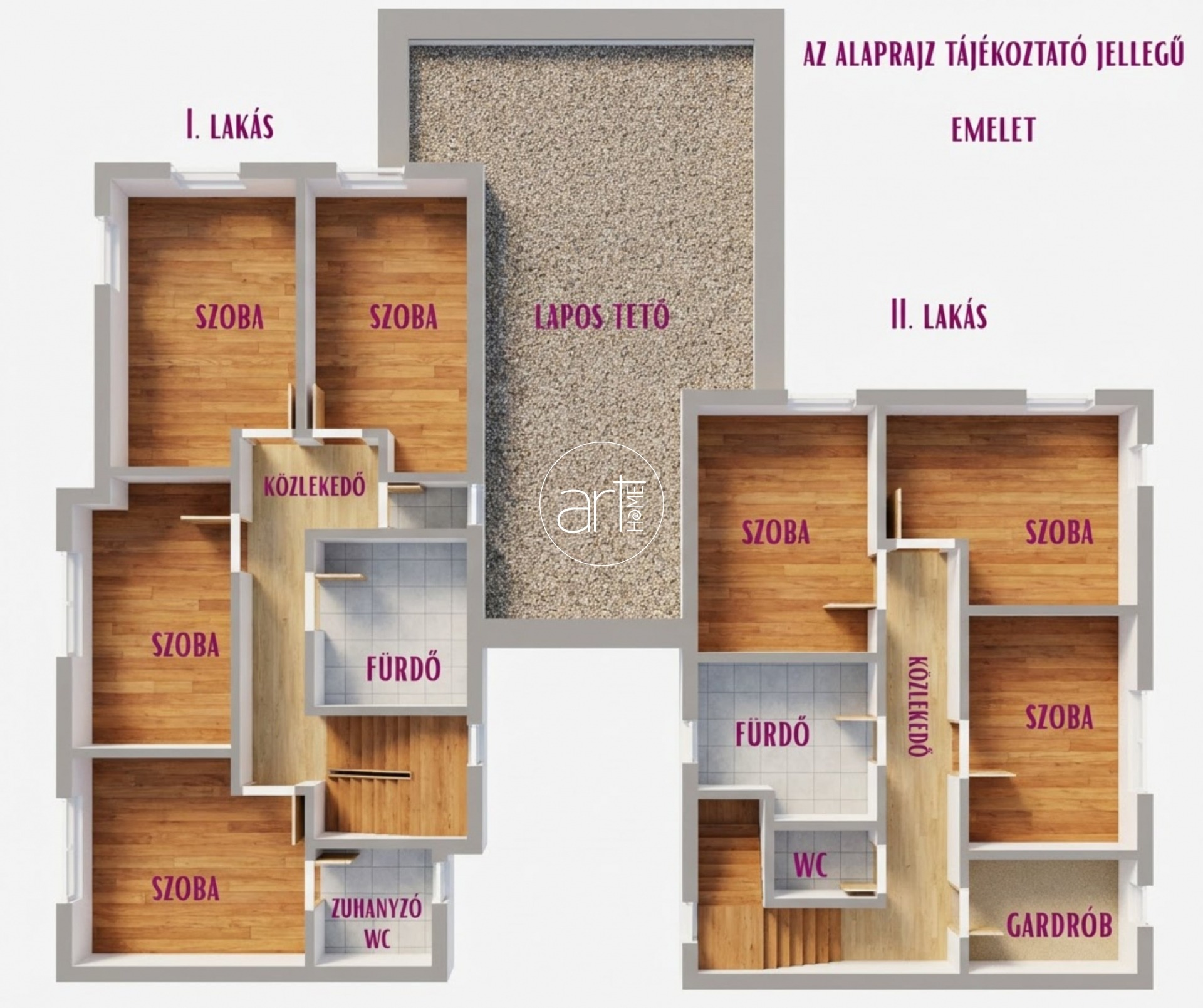 - Nappali, konyha, 4 külön háló szoba, 2 fürdő, 2 WC, háztartási helyiség, tároló