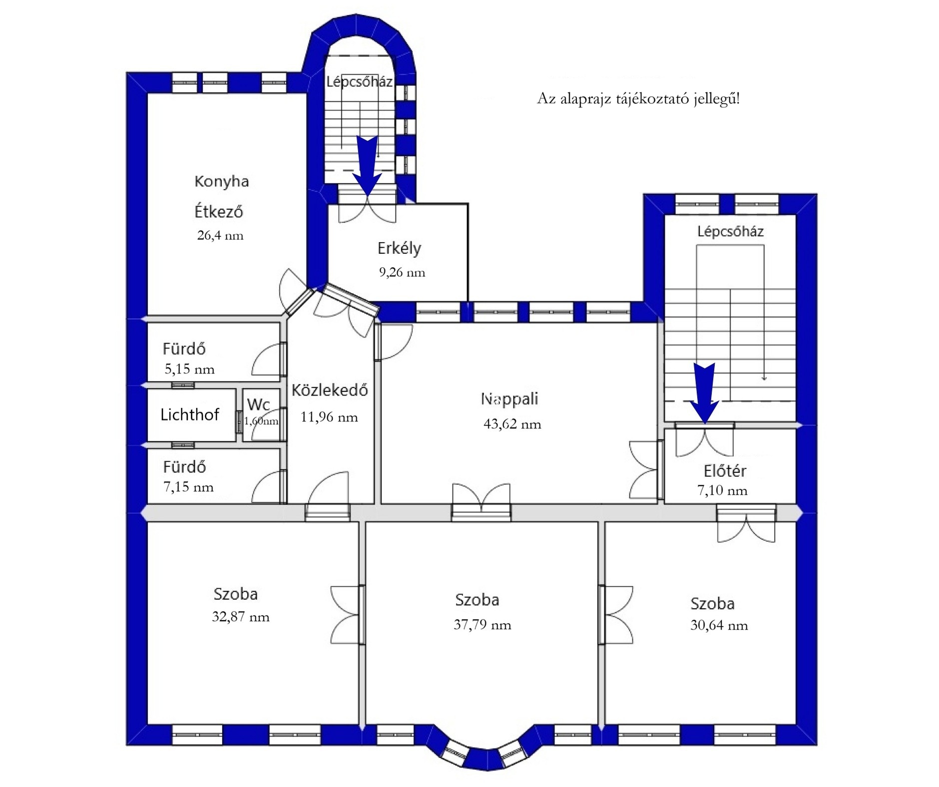 - Mért adatok szerint: lakás 208 m² + 9 m² erkély