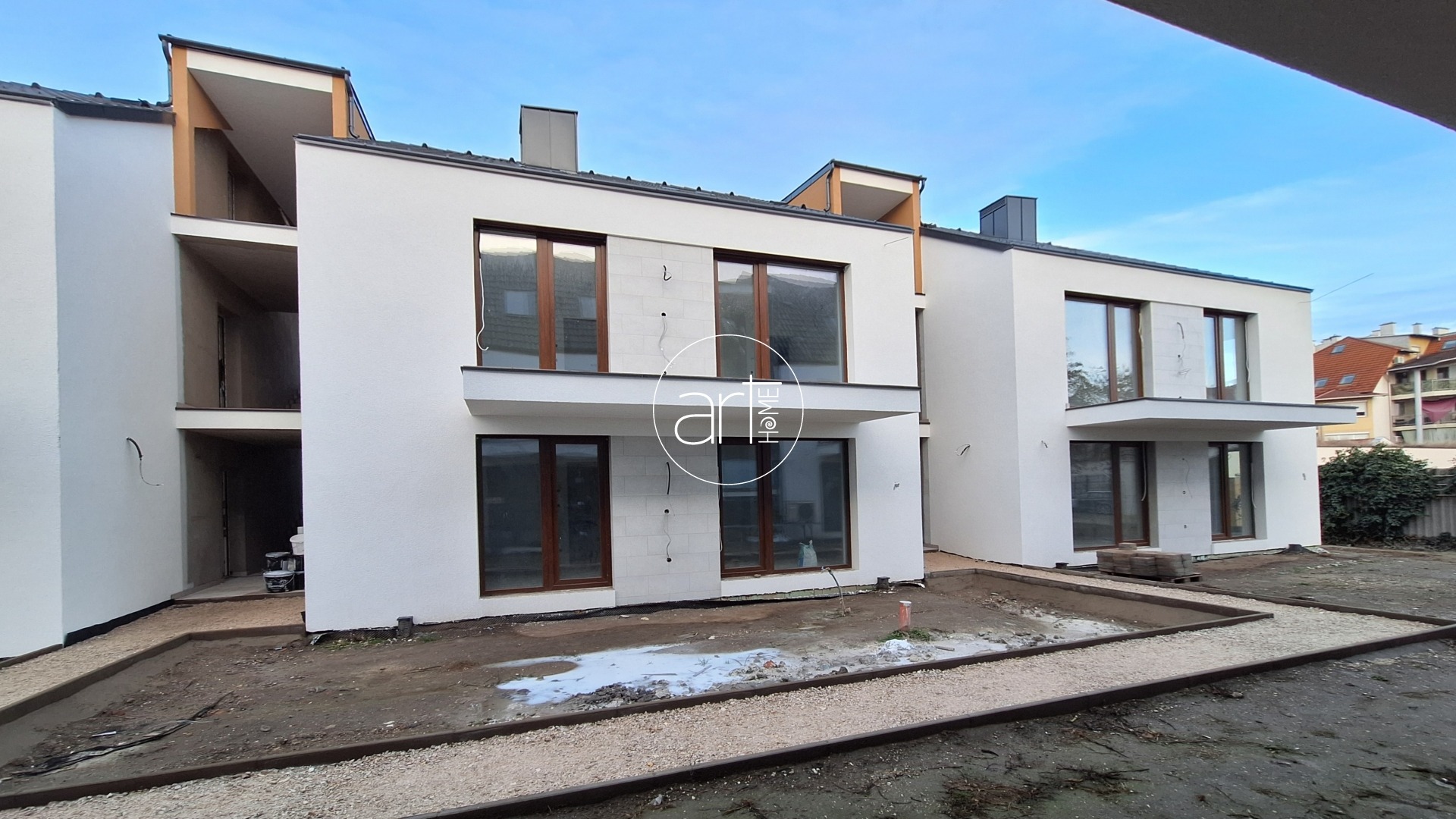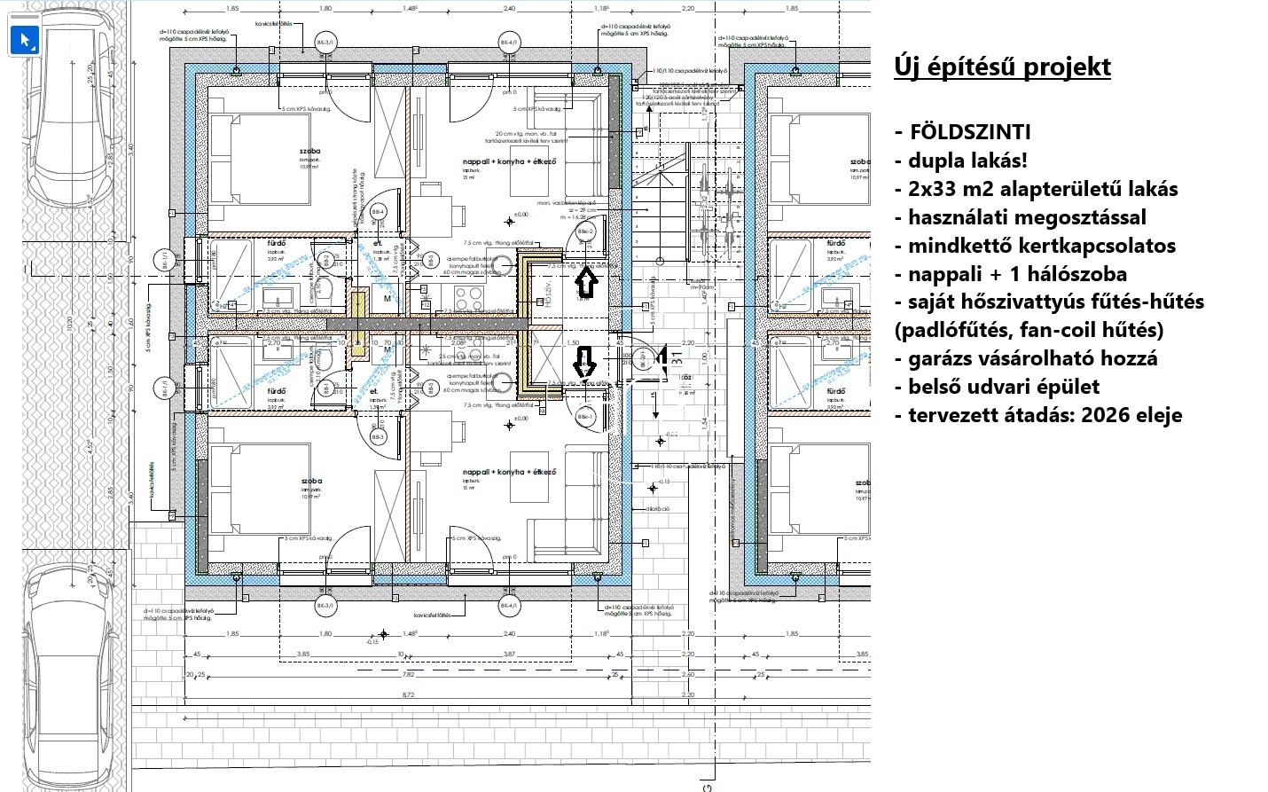 Egy most épülő társasházban kínálom ezt a két, egyenként 33 m2 hasznos alapterületű, nappali + 1 hálós, kb 15 m2 saját kerttel rendelkező földszinti, akadálymentes lakást eladásra. Az épület csupán 2 lakószintből, és padlástérből áll. Szintenként 4 lakóegység épül.