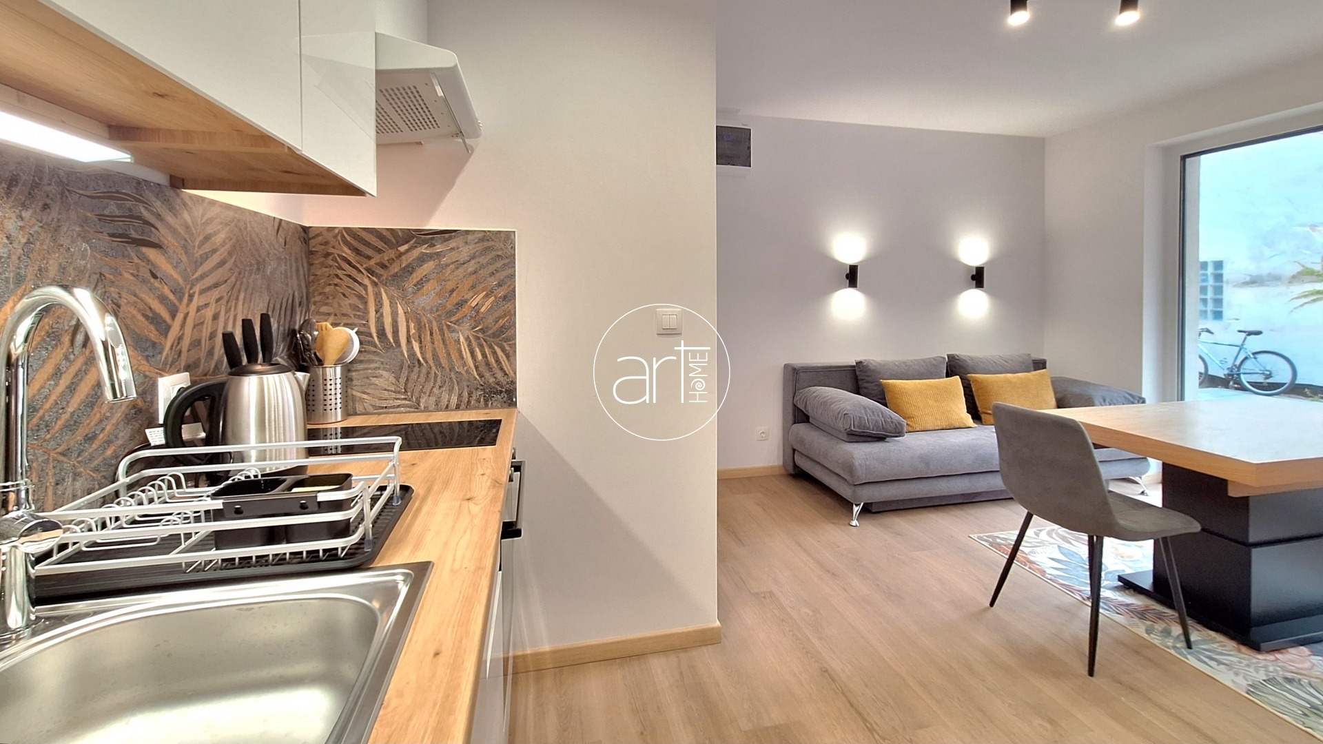 A nappalija a modern igényekhez igazodik, nyitott, a konyhával egy légtérben alakították ki. Nagy méretű üvegportáljának köszönhetően minden évszakban nagyon hangulatos. Mind a nappaliból, mind pedig a hálószobából közvetlenül a kertünkbe léphetünk ki hatalmas üvegportálon keresztül.