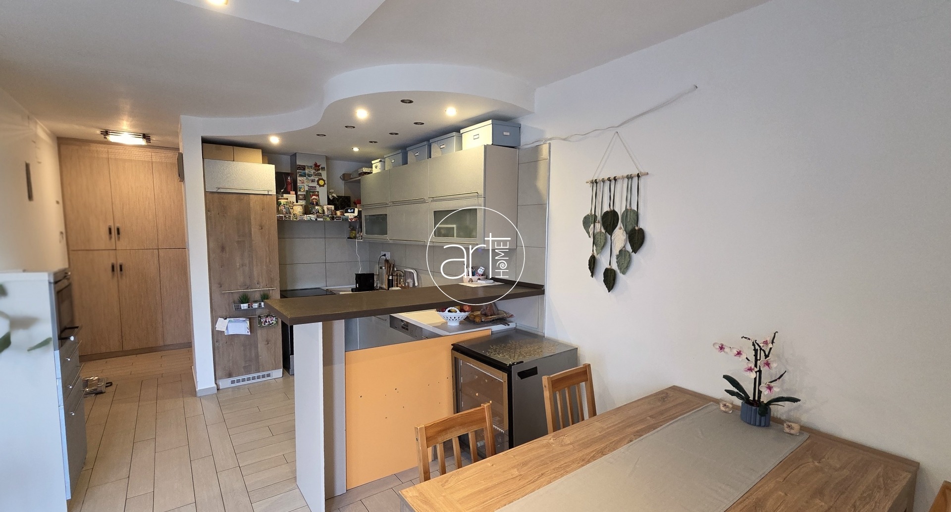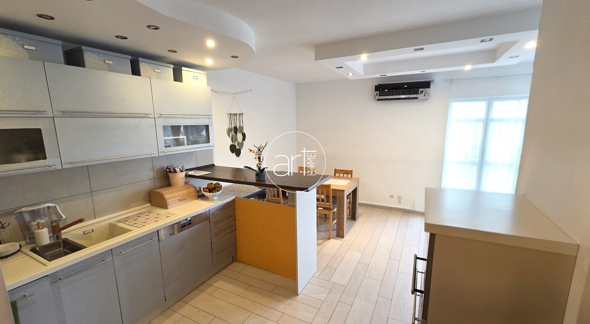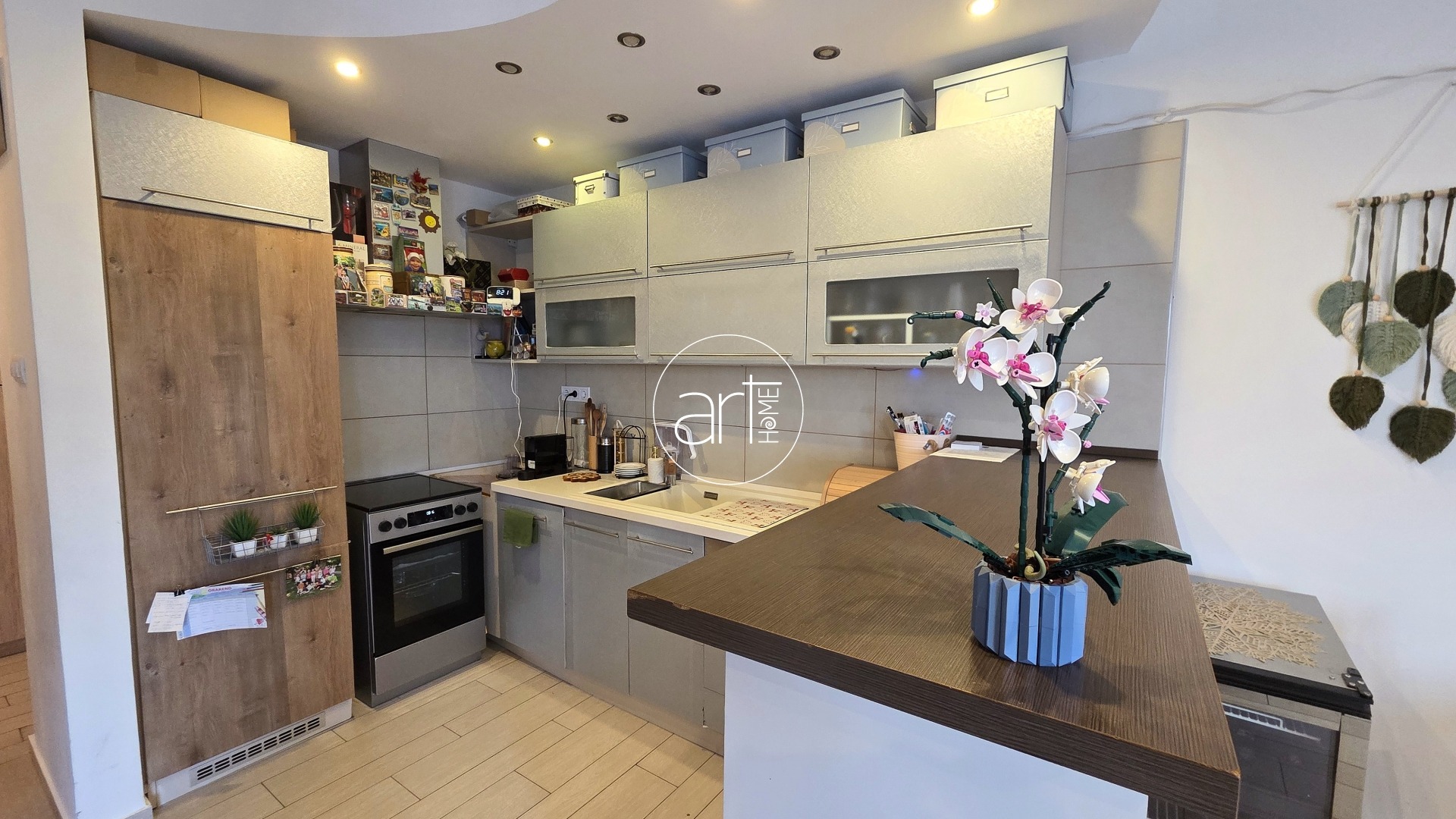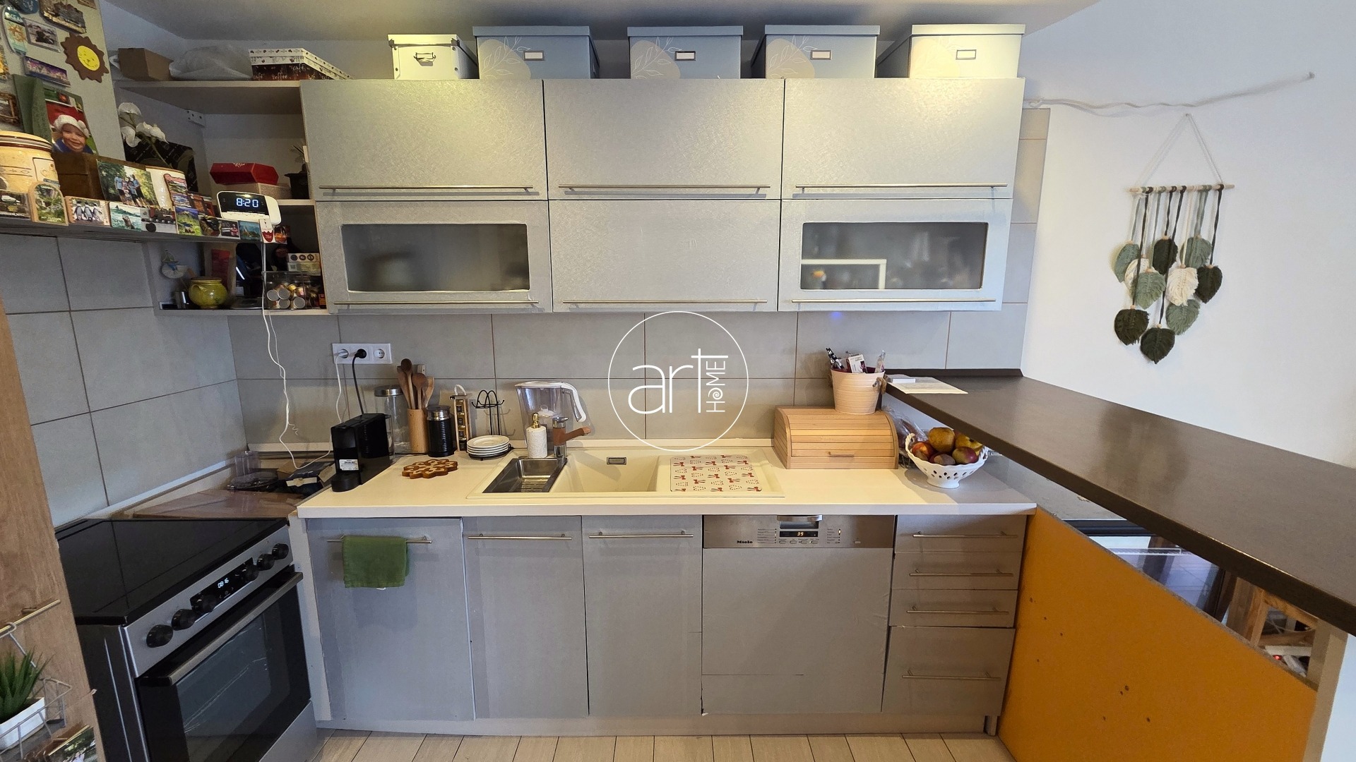 A modern konyha beépített elektromos tűzhellyel, beépített mosogatógéppel, hűtővel felszerelt.