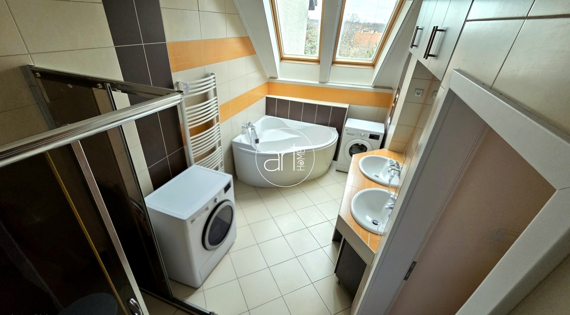 A tágas, napfényes fürdőszobában sarokkád, zuhanyzó, dupla mosdókagyló, WC kapott helyet, emellett az ingatlanban külön mellékhelyiség is megtalálható.