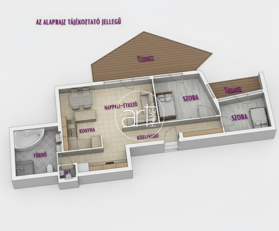 A hálószobák mérete ideális, a nagyobb szobából és a nappaliból közvetlenül a tetőteraszra, a kisebbik hálószobából pedig az erkélyre léphetünk ki.