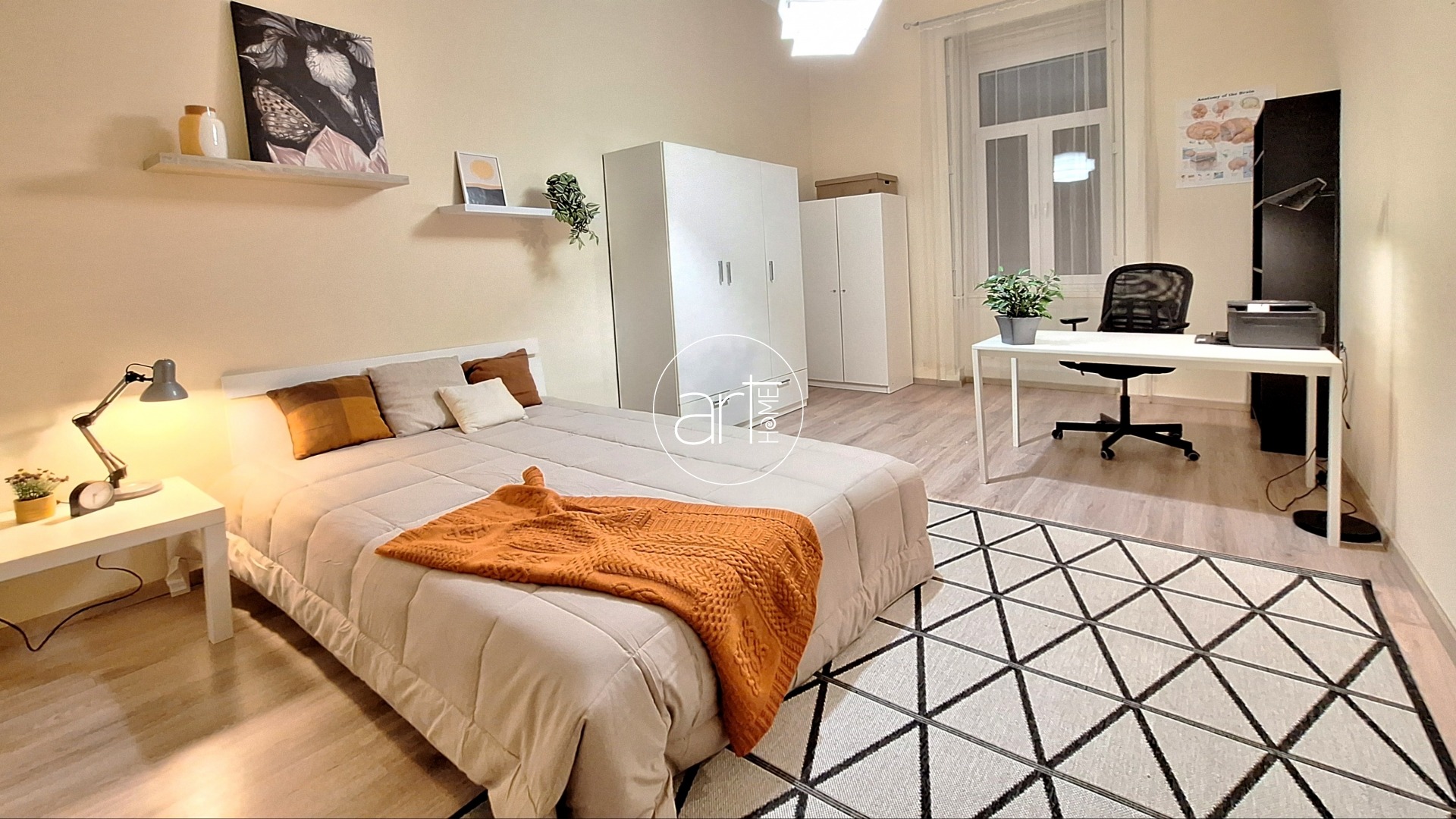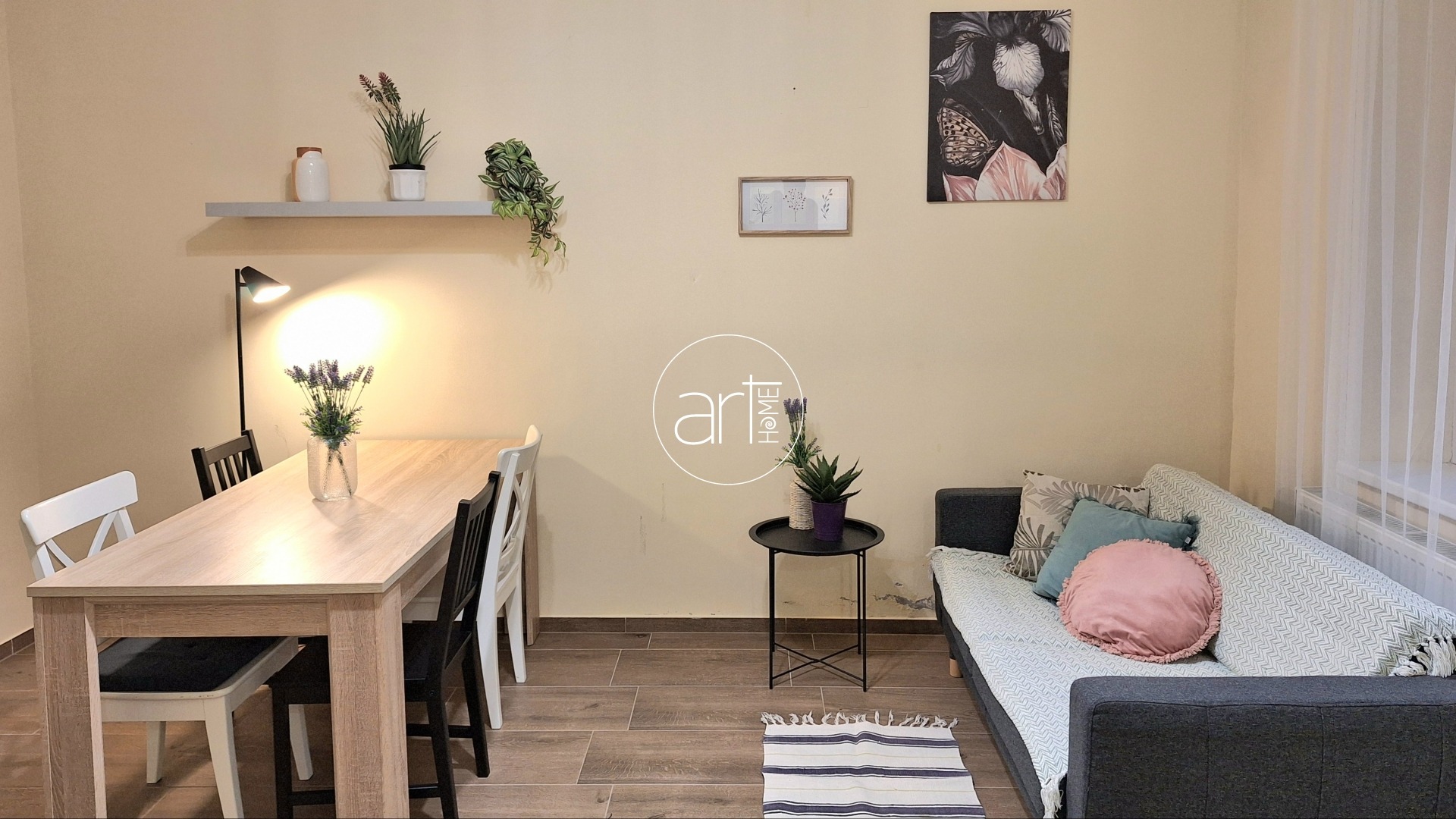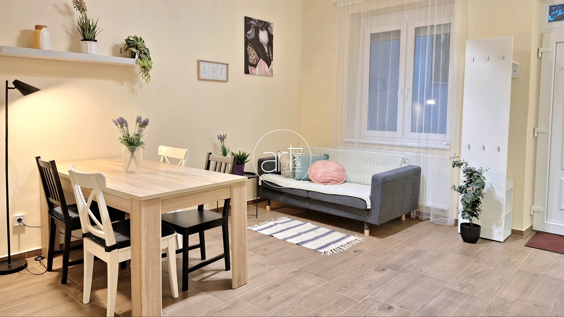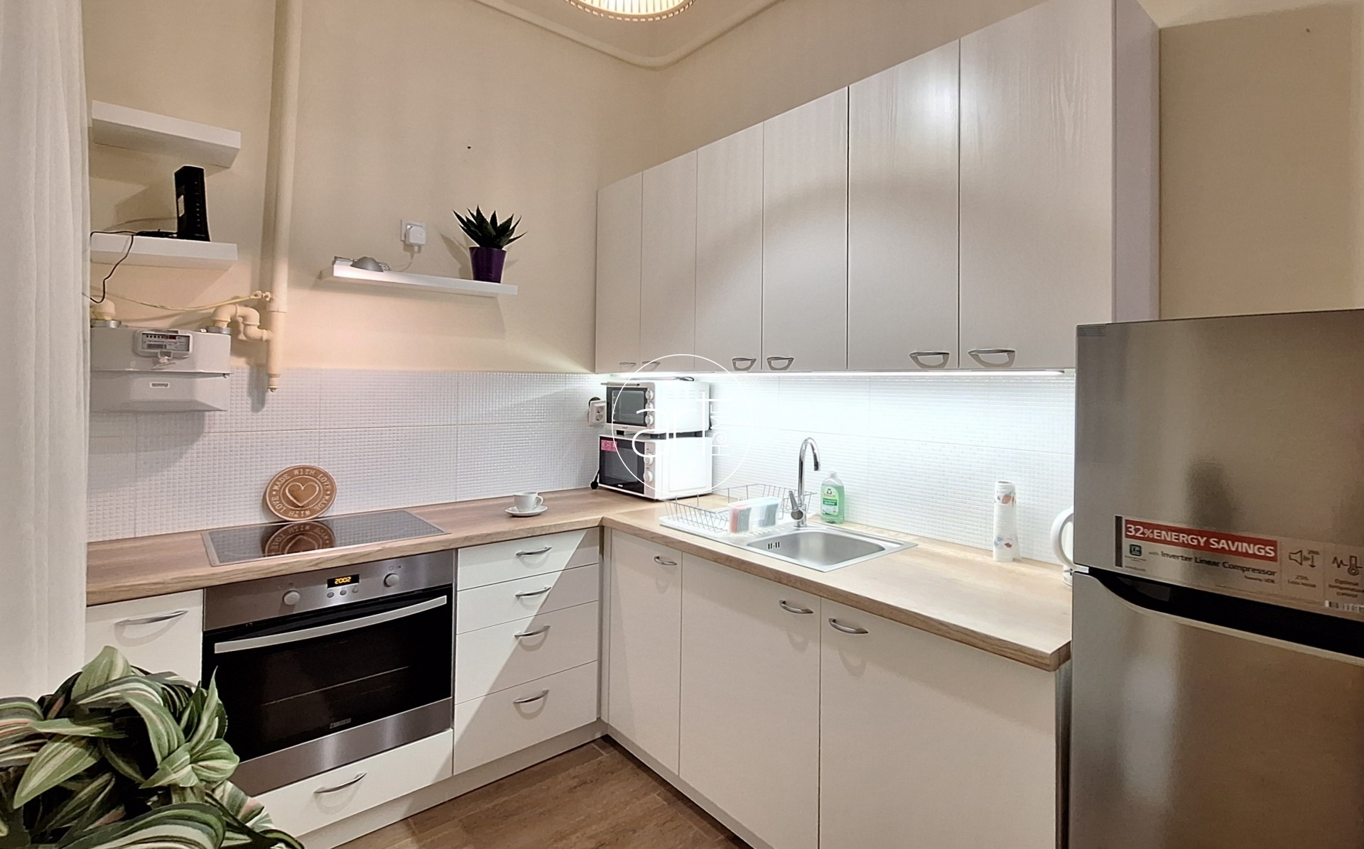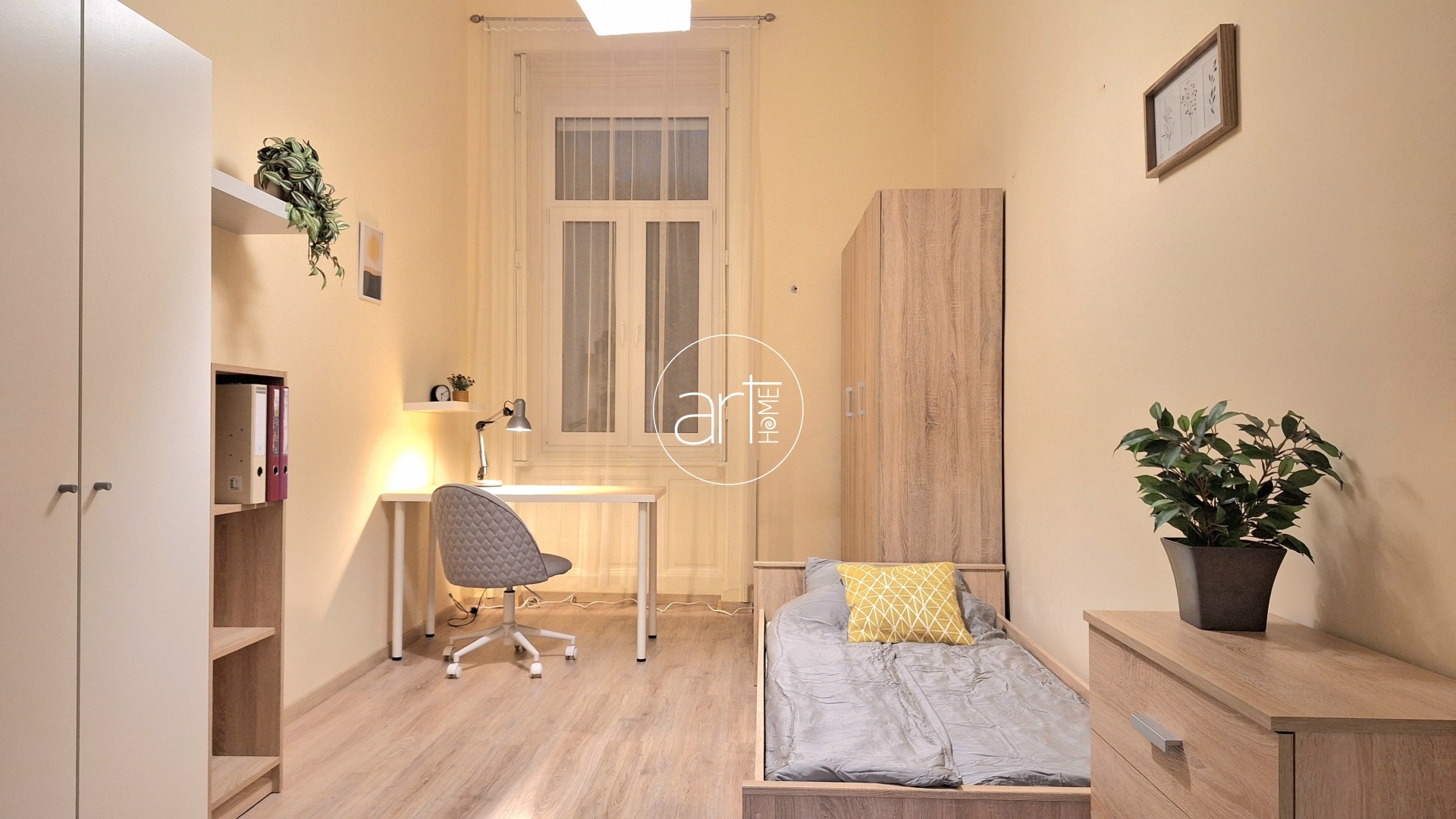 Teljes körűen felújított, bútorozott és gépesített, így azonnal költözhető. A tágas központi térben étkező, konyha és nappali egyesül, mellette két külön nyíló hálószoba található – ággyal, szekrénnyel, íróasztallal berendezve, így tökéletes két diák vagy két dolgozó számára. A fürdő ízlésesen felújított, dupla mosdókagylóval felszerelt. Épített zuhanyzója modernné teszi. A WC külön helyiségben található.