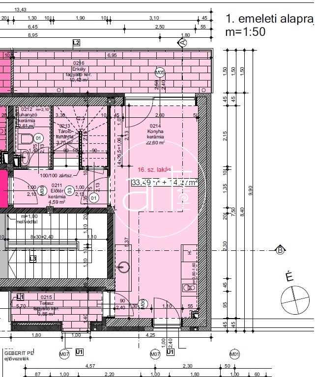Az ingatlan az 1. emeleten helyezkedik el. Netto alapterülete 74 m2, és minden szobához külön erkély is tartozik, amelyek összterülete 18 m2. Ezek mindegyike a belső udvarra néz.