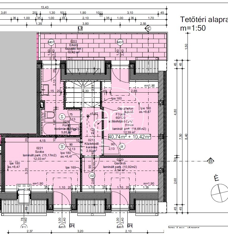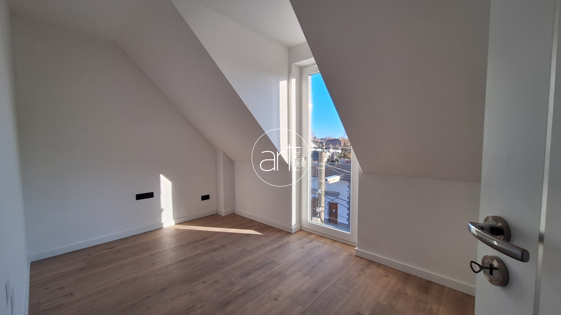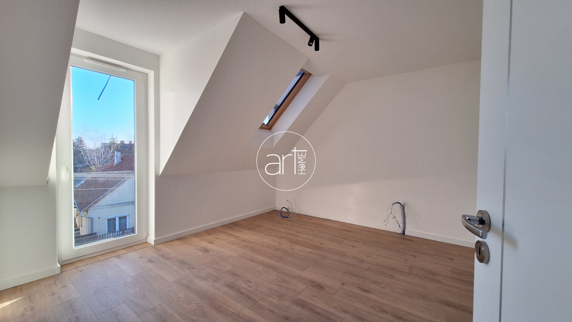 A felső szinten két szoba és egy félszoba található, itt a kádas fürdőszoba és wc egy helyiségben kapott helyet. A 10,42 m2-es erkélyre a fürdőszobából és az egyik szobából is ki lehet jutni.
