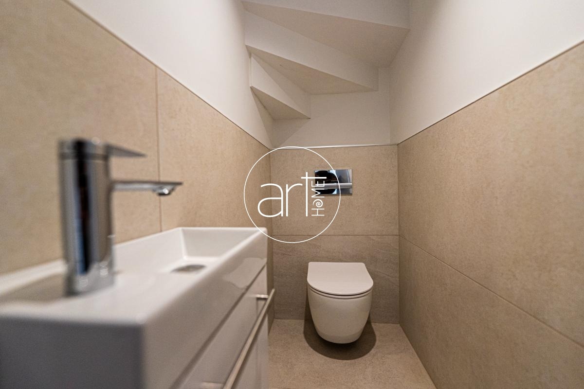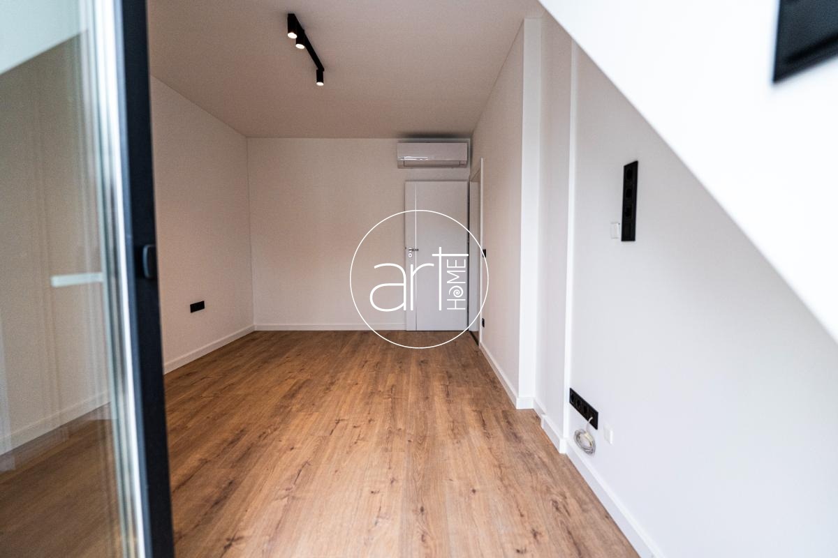 Az alsó szinten található egy amerikai konyhás nappali, egy tusolós fürdőszoba és külön wc. A nappaliból nyílik egy 10, 42 m2-es és egy 4 m2-es erkély is.